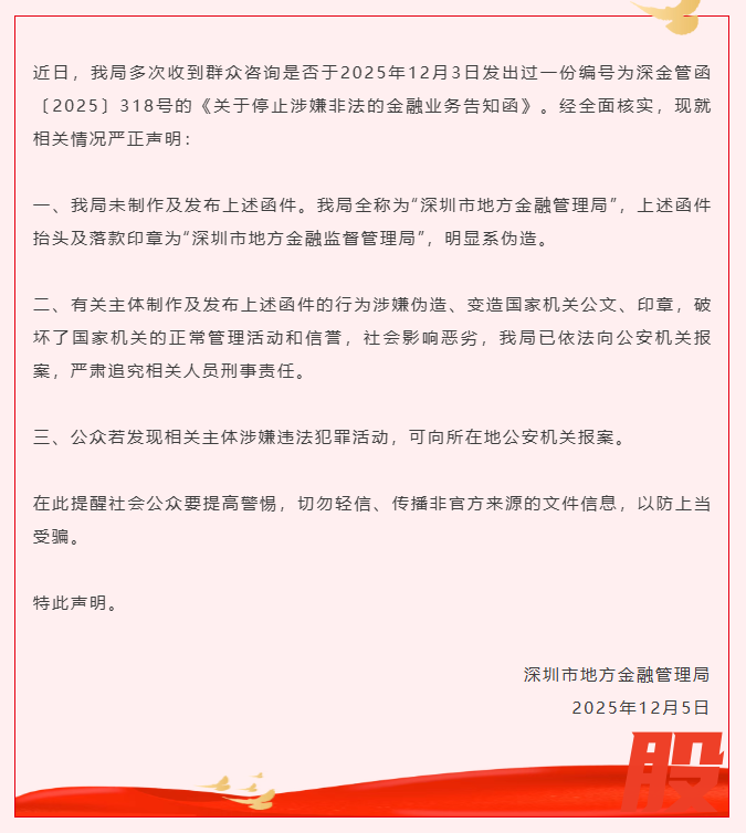 日前,深圳市地方金融管理局发表声明称,从未制作发布编号为深金管函〔2025〕318号的《关于停止涉嫌非法的金融业务告知函》。