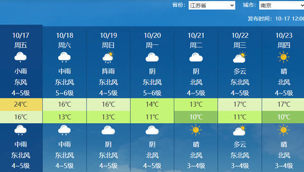 r明天起,我国南方也将陆续出现降温,未来几天,最高气温30℃以上的区域将逐渐向南收缩,大片地区将频现新低。如地处江淮的南京,明天最高气温就将降至16℃,创立秋后最高气温新低。
